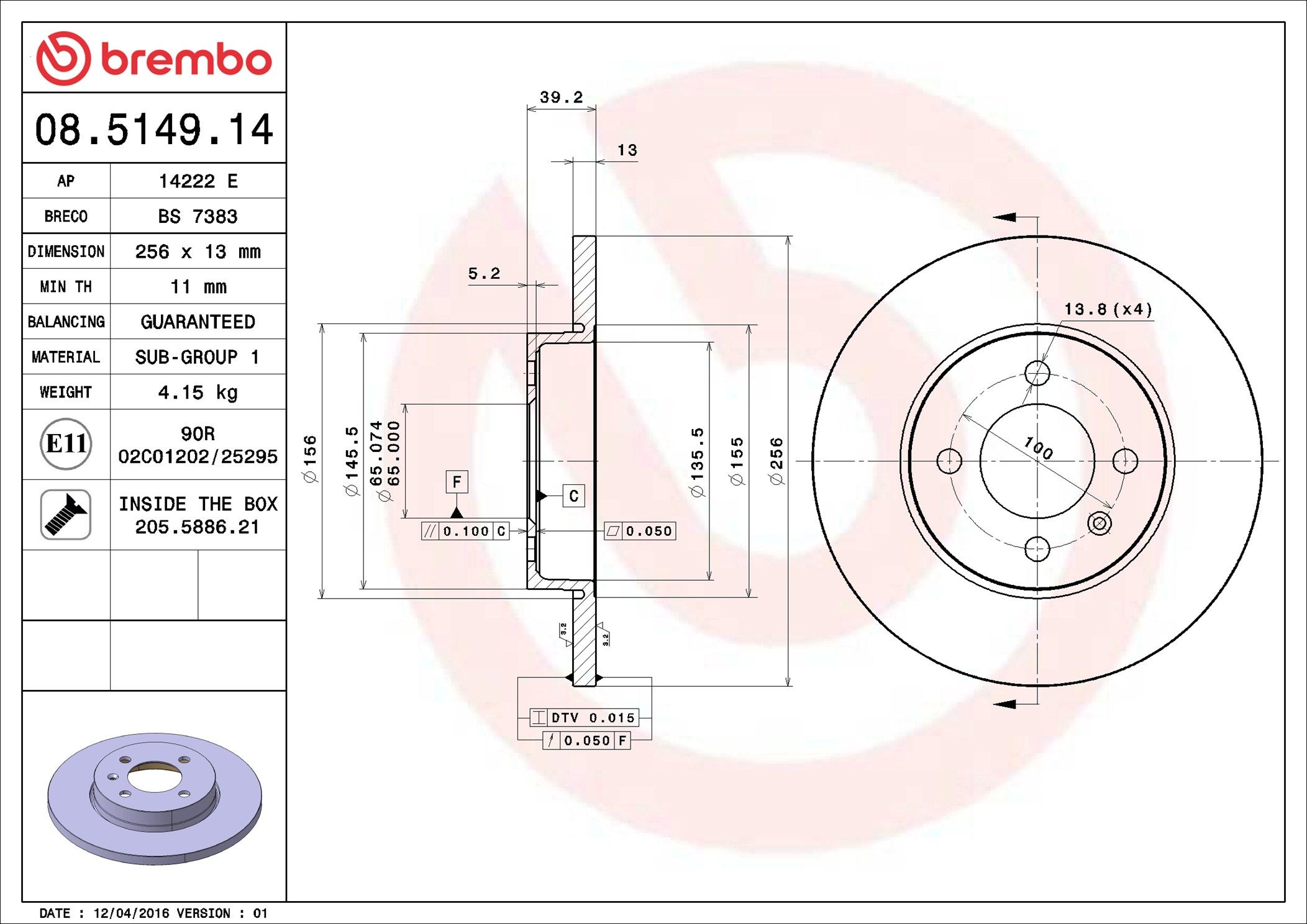 Proizvođač: BREMBO | Vrsta kočionog diska: pun | Debljina kočionog diska [mm]: 13mm | Broj otvora: 4 | Dopunski proizvod/dopunska informacija 2: sa vijcima | Visina [mm]: 39mm | Prečnik centriranja [mm]: 65mm | Spoljašnji prečnik [mm]: 256mm | Minimalna debljina [mm]: 11mm | Obrtni moment pri pokretanju [Nm]: 110Nm | Spart line kod: bb08514914 | GTIN: 8020584013212