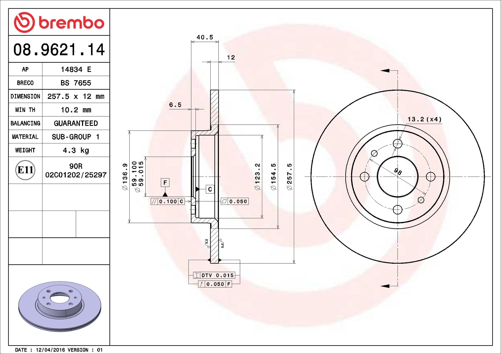 Proizvođač: BREMBO | Vrsta kočionog diska: pun | Debljina kočionog diska [mm]: 12mm | Broj otvora: 4 | Visina [mm]: 41mm | Prečnik centriranja [mm]: 59mm | Spoljašnji prečnik [mm]: 257mm | Minimalna debljina [mm]: 10mm | Obrtni moment pri pokretanju [Nm]: 2Nm | Spart line kod: bb08962114 | GTIN: 8020584962114