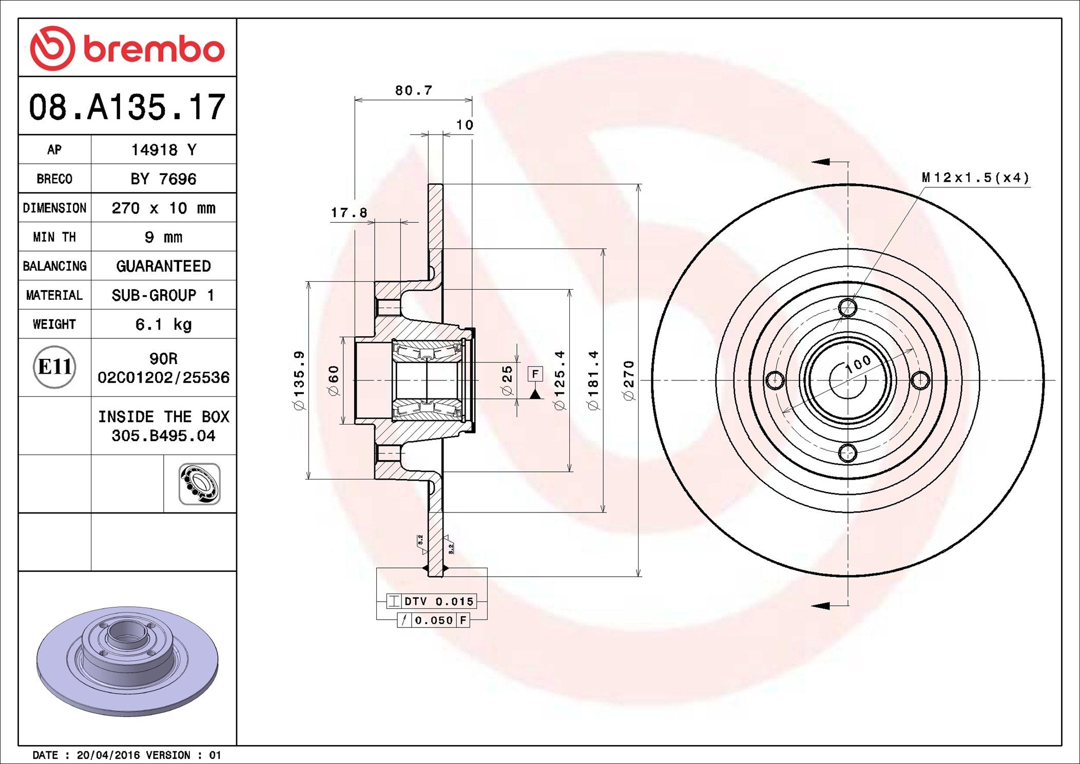 Proizvođač: BREMBO | Vrsta kočionog diska: pun | Debljina kočionog diska [mm]: 10mm | Broj otvora: 4 | Dopunski proizvod/dopunska informacija 2: sa kompletom ležaja točka | Dopunski proizvod/dopunska informacija 2: sa ABS-senzorom u obliku prstena | Visina [mm]: 80mm | Prečnik centriranja [mm]: 25mm | Spoljašnji prečnik [mm]: 270mm | Minimalna debljina [mm]: 9mm | Obrtni moment pri pokretanju [Nm]: 110Nm | Spart line kod: bb08a13517 | GTIN: 8020584015438
