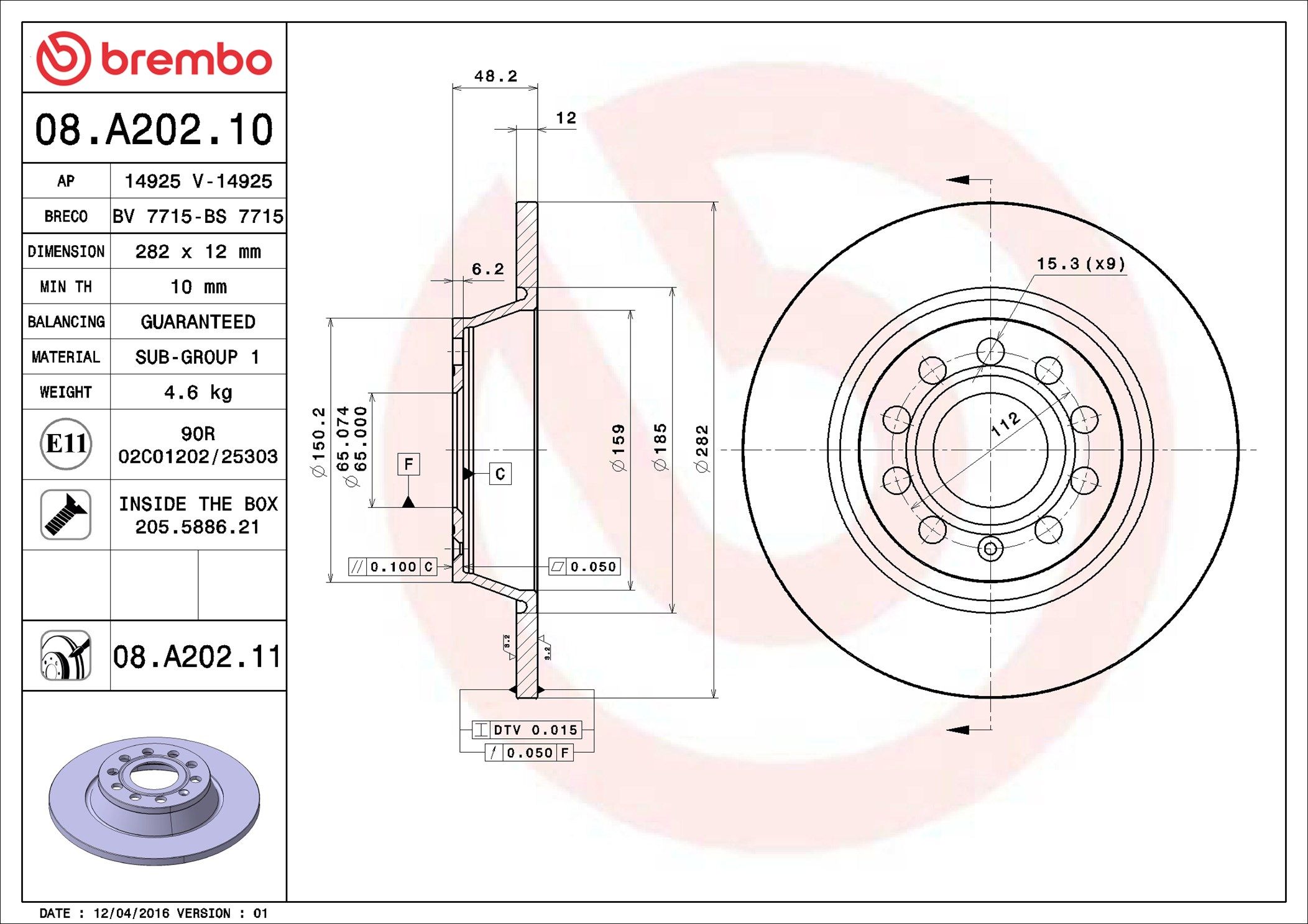 Proizvođač: BREMBO | Vrsta kočionog diska: pun | Debljina kočionog diska [mm]: 12mm | Broj otvora: 5 | Dopunski proizvod/dopunska informacija 2: sa vijcima | Visina [mm]: 48mm | Prečnik centriranja [mm]: 65mm | Spoljašnji prečnik [mm]: 282mm | Površina: prevučeno slojem | Minimalna debljina [mm]: 10mm | Obrtni moment pri pokretanju [Nm]: 120Nm | Spart line kod: bb08a20211 | GTIN: 8020584024812