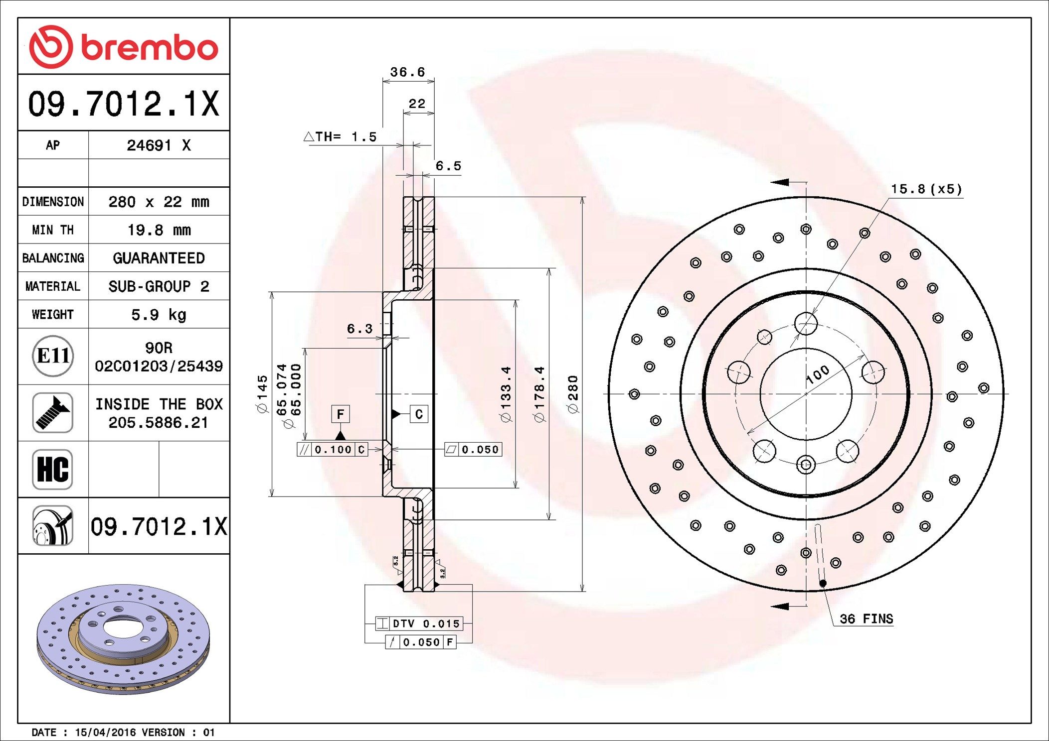 Proizvođač: BREMBO | Vrsta kočionog diska: perforiran/sa unutraš. ventilac. | Debljina kočionog diska [mm]: 22mm | Broj otvora: 5 | Dopunski proizvod/dopunska informacija 2: sa vijcima | Visina [mm]: 37mm | Prečnik centriranja [mm]: 65mm | Spoljašnji prečnik [mm]: 280mm | Obrada: vrlo karbonizovan | Površina: prevučeno slojem | Minimalna debljina [mm]: 19mm | Obrtni moment pri pokretanju [Nm]: 8Nm | Spart line kod: bb0970121x | GTIN: 8020584212479