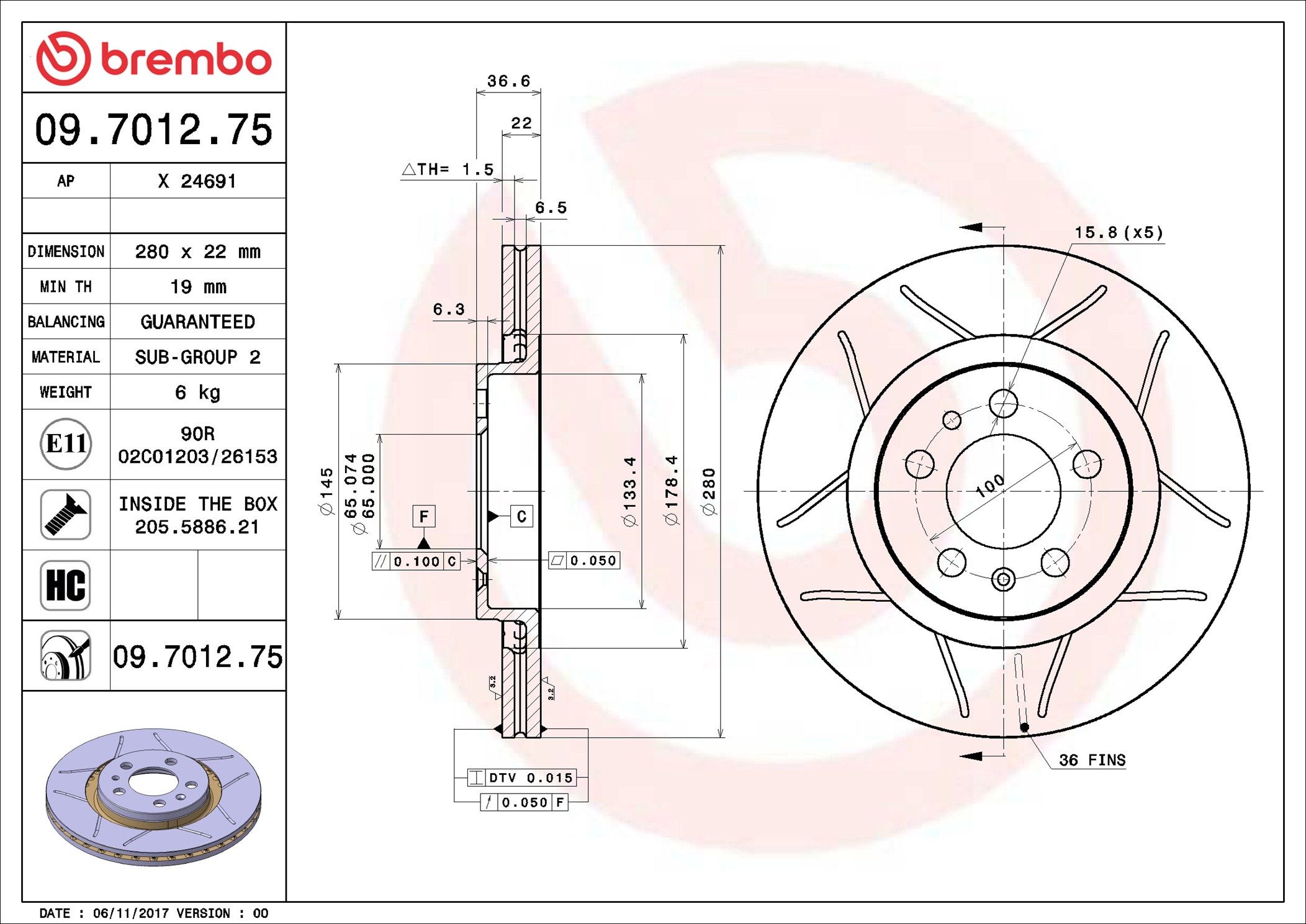 Proizvođač: BREMBO | Vrsta kočionog diska: sa unutrašnjom ventilacijom | Vrsta kočionog diska: sa prorezom | Debljina kočionog diska [mm]: 22mm | Broj otvora: 5 | Dopunski proizvod/dopunska informacija 2: sa vijcima | Visina [mm]: 37mm | Prečnik centriranja [mm]: 65mm | Spoljašnji prečnik [mm]: 280mm | Obrada: vrlo karbonizovan | Površina: prevučeno slojem | Minimalna debljina [mm]: 19mm | Obrtni moment pri pokretanju [Nm]: 120Nm | Spart line kod: bb09701275 | GTIN: 8020584011447