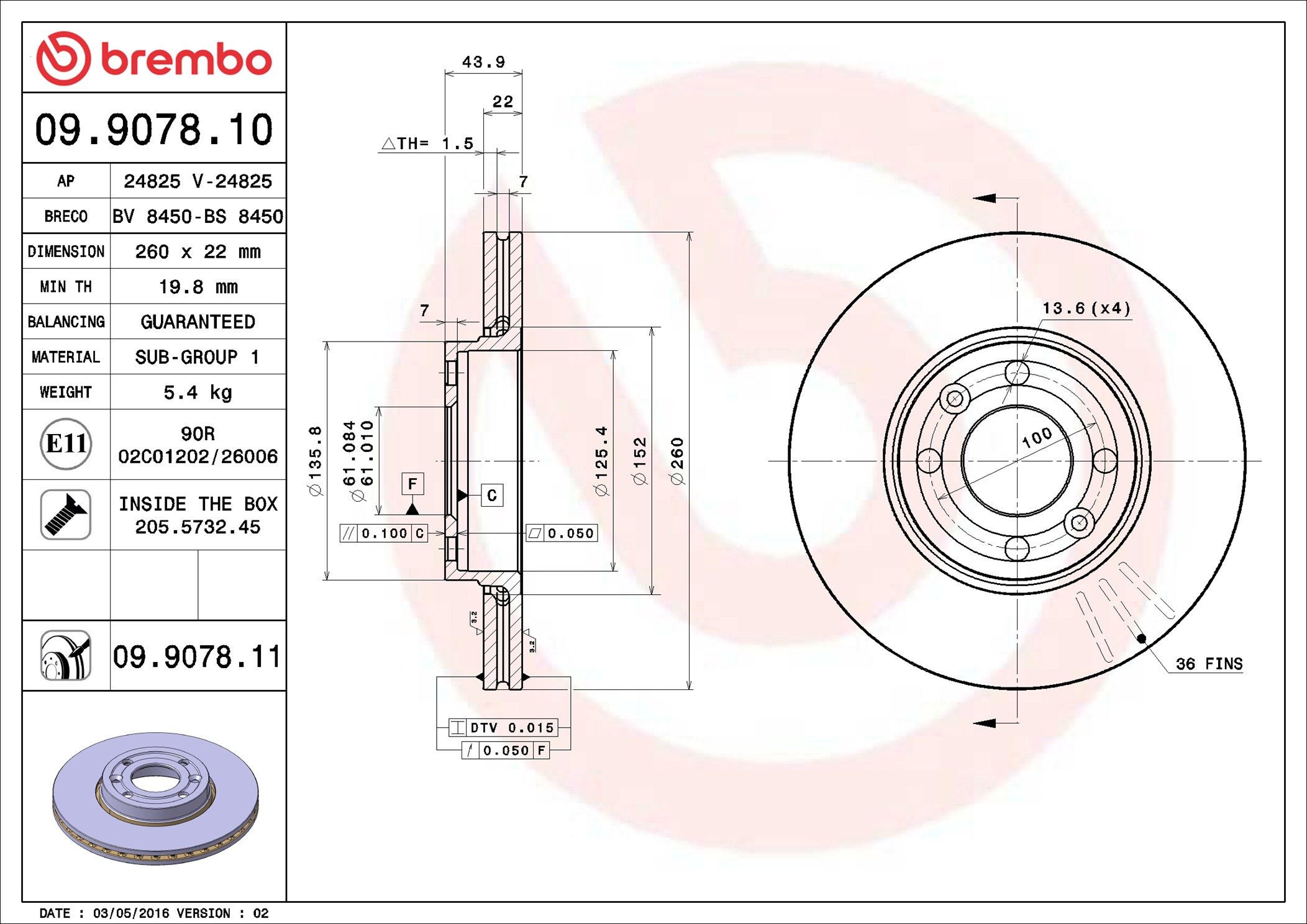 Proizvođač: BREMBO | Vrsta kočionog diska: sa unutrašnjom ventilacijom | Debljina kočionog diska [mm]: 22mm | Broj otvora: 4 | Dopunski proizvod/dopunska informacija 2: sa vijcima | Visina [mm]: 44mm | Prečnik centriranja [mm]: 61mm | Spoljašnji prečnik [mm]: 260mm | Minimalna debljina [mm]: 19mm | Obrtni moment pri pokretanju [Nm]: 8Nm | Spart line kod: bb09907810 | GTIN: 8020584907818