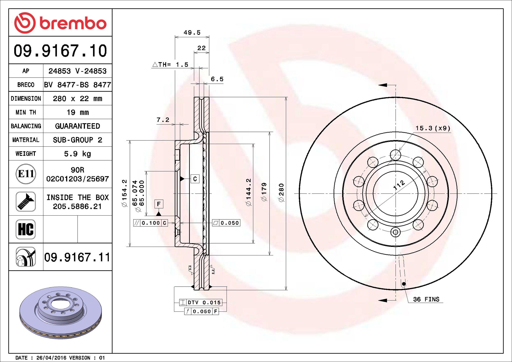 Proizvođač: BREMBO | Vrsta kočionog diska: sa unutrašnjom ventilacijom | Debljina kočionog diska [mm]: 22mm | Broj otvora: 5 | Dopunski proizvod/dopunska informacija 2: sa vijcima | Visina [mm]: 50mm | Prečnik centriranja [mm]: 65mm | Spoljašnji prečnik [mm]: 280mm | Obrada: vrlo karbonizovan | Površina: prevučeno slojem | Minimalna debljina [mm]: 19mm | Obrtni moment pri pokretanju [Nm]: 120Nm | Spart line kod: bb09916711 | GTIN: 8020584022849