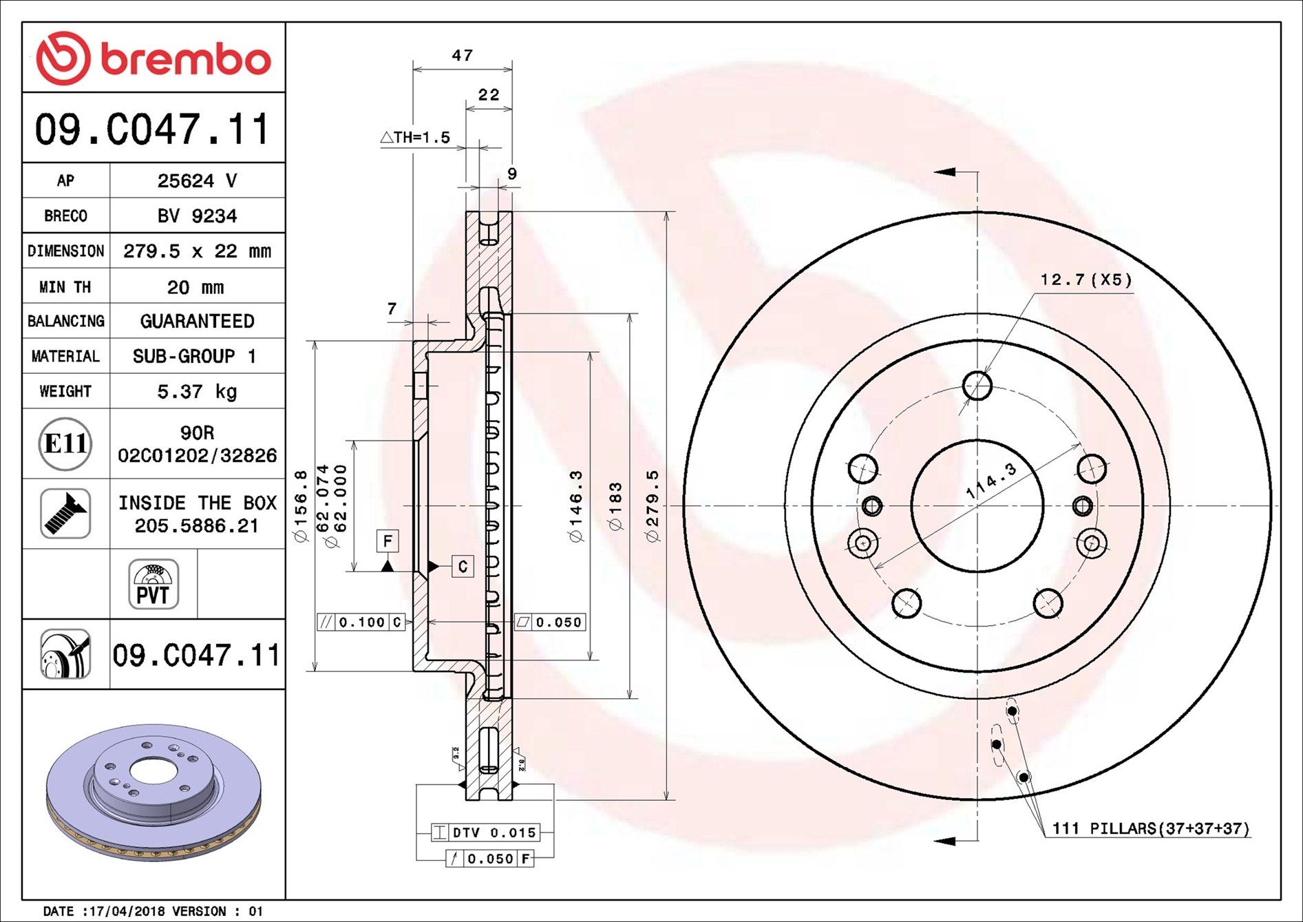 Proizvođač: BREMBO | Vrsta kočionog diska: sa unutrašnjom ventilacijom | Debljina kočionog diska [mm]: 22mm | Broj otvora: 5 | Dopunski proizvod/dopunska informacija 2: sa vijcima | Visina [mm]: 47mm | Prečnik centriranja [mm]: 62mm | Spoljašnji prečnik [mm]: 280mm | Površina: prevučeno slojem | Minimalna debljina [mm]: 20mm | Spart line kod: bb09c04711 | GTIN: 8020584226896