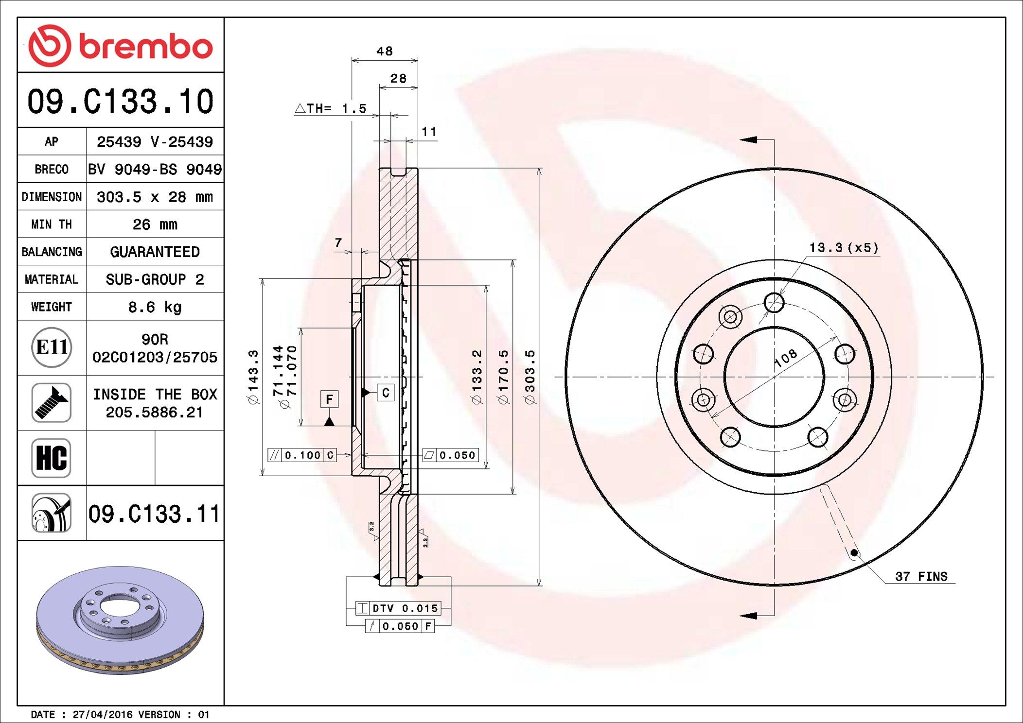 Proizvođač: BREMBO | Vrsta kočionog diska: sa unutrašnjom ventilacijom | Debljina kočionog diska [mm]: 28mm | Broj otvora: 5 | Dopunski proizvod/dopunska informacija 2: sa vijcima | Visina [mm]: 48mm | Prečnik centriranja [mm]: 71mm | Spoljašnji prečnik [mm]: 304mm | Obrada: vrlo karbonizovan | Površina: prevučeno slojem | Minimalna debljina [mm]: 26mm | Spart line kod: bb09c13311 | GTIN: 8020584220993