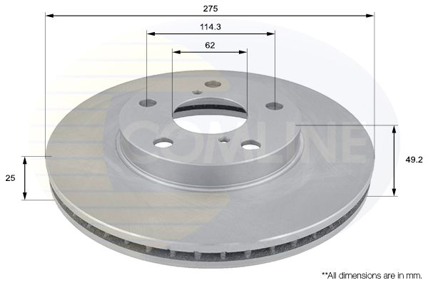Proizvođač: COMLINE | Vrsta kočionog diska: sa unutrašnjom ventilacijom | Spoljašnji prečnik [mm]: 275mm | Debljina kočionog diska [mm]: 25mm | Visina [mm]: 49mm | Ø otvora za šrafove [mm]: 2mm | Prečnik centriranja [mm]: 114mm | Broj otvora: 3 | Površina: 62 | Minimalna debljina [mm]: 5mm | Broj otvora: prevučeno slojem | Spart line kod: coadc01100v | GTIN: 5055181526271