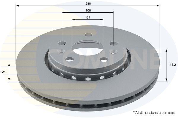 Proizvođač: COMLINE | Vrsta kočionog diska: sa unutrašnjom ventilacijom | Spoljašnji prečnik [mm]: 280mm | Debljina kočionog diska [mm]: 24mm | Visina [mm]: 44mm | Ø otvora za šrafove [mm]: 2mm | Prečnik centriranja [mm]: 108mm | Broj otvora: 61 | Površina: 5 | Minimalna debljina [mm]: prevučeno slojemmm | Broj otvora: 21 | Spart line kod: coadc1593v | GTIN: 5055339181970