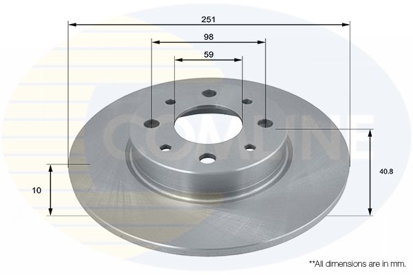 Proizvođač: COMLINE | Vrsta kočionog diska: pun | Spoljašnji prečnik [mm]: 251mm | Debljina kočionog diska [mm]: 10mm | Visina [mm]: 40mm | Ø otvora za šrafove [mm]: 8mm | Prečnik centriranja [mm]: 98mm | Broj otvora: 59 | Površina: 4 | Minimalna debljina [mm]: prevučeno slojemmm | Broj otvora: 9 | Spart line kod: coadc1835 | GTIN: 5055339182038