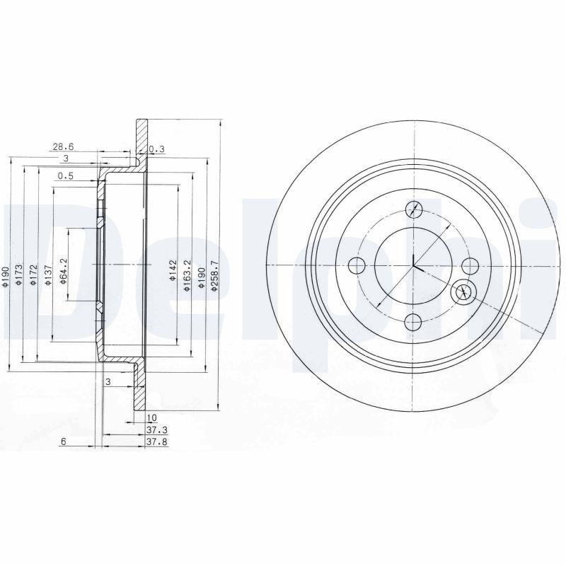 Proizvođač: DELPHI | Vrsta kočionog diska: pun | Broj otvora: 4 | Kontrolna oznaka: E1 90R-02C0100/1604 | Površina: prevučeno slojem | Spoljašnji prečnik [mm]: 259mm | Debljina kočionog diska [mm]: 10mm | Minimalna debljina [mm]: 8mm | Prečnik centriranja [mm]: 4mm | Visina [mm]: 64mm | Spart line kod: dlbg3662c | GTIN: 5012759533611