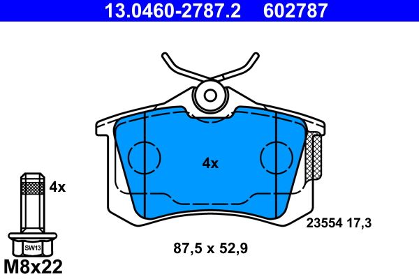 Proizvođač: ATE | Širina [mm]: 87mm | Visina [mm]: 5mm | Debljina [mm]: 52mm | Indikator za upozorenje na habanje: 9 | Indikator za upozorenje na habanje: 17 | Dopunski proizvod/dopunska informacija 2: 3 | Broj vijaka: bez indikatora za upozorenje na habanje | Kočioni sistem: nije pripremljeno za indikator za upozorenje na habanje | Kontrolna oznaka: sa vijcima za kočione čeljusti | Postoji MAPP-kod (oznaka za originalni rezervni deo): 4 | Spart line kod: ae130460-27872 | GTIN: 4006633419284