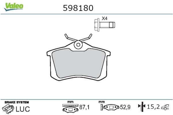 Proizvođač: VALEO | Strana ugradnje: Zadnja osovina | Kočioni sistem: LUCAS | Dopunski proizvod/dopunska informacija 2: sa vijcima | Širina [mm]: 87mm | Visina [mm]: 52mm | Debljina [mm]: 9mm | WVA-broj: 15 | Indikator za upozorenje na habanje: 2 | Dopunski proizvod/dopunska informacija 2: 20960 | Kontrolna oznaka: bez indikatora za upozorenje na habanje | Spart line kod: vl598180 | GTIN: 3276425981805