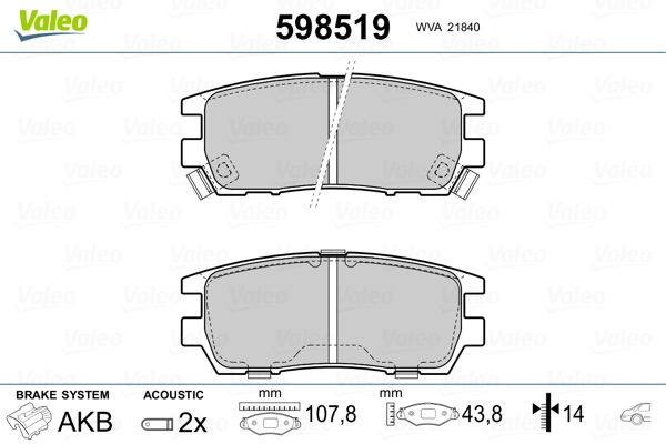 Proizvođač: VALEO | Strana ugradnje: Zadnja osovina | Kočioni sistem: AKEBONO | Širina [mm]: 108mm | Visina [mm]: 43mm | Debljina [mm]: 8mm | WVA-broj: 14 | Indikator za upozorenje na habanje: 21840 | Broj indikatora istrošenosti [po osovini]: uklj. indikator za upozorenje na habanjepo osovini | Rezim rada: 2 | Dopunski proizvod/dopunska informacija 2: mehanički | Kontrolna oznaka: bez anti-deformacionog lima | Spart line kod: vl598519 | GTIN: 3276425985193